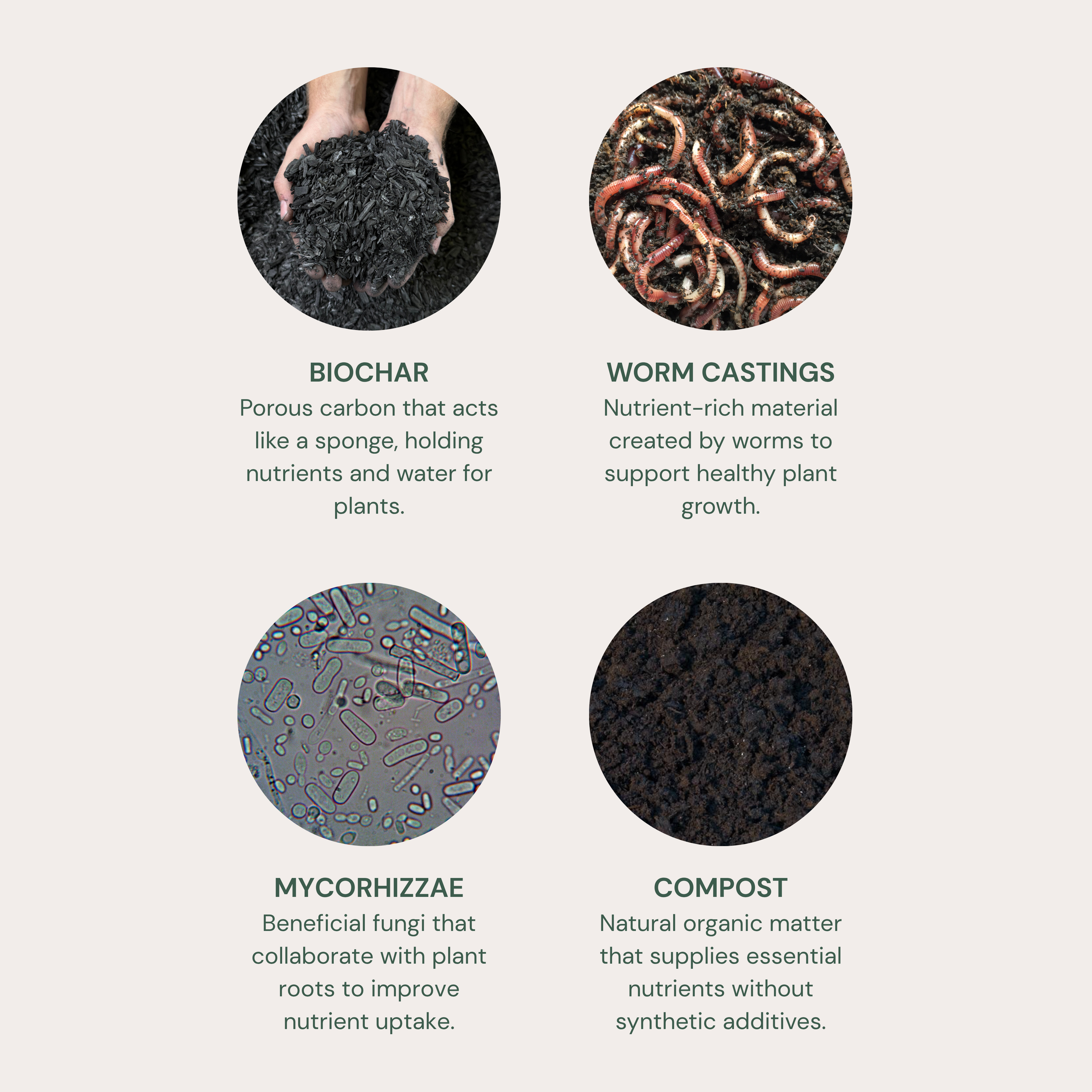 Biochar forms the foundation of our blend, but additional ingredients are key to supporting thriving plants. Each component plays a specific role in creating a healthy, living soil ecosystem.